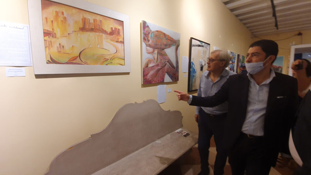 l Presidente di Spoleto Arte Salvo Nugnes ed il critico d’arte Vittorio Sgarbi visionano l’opera durante il vernissage dell’esposizione