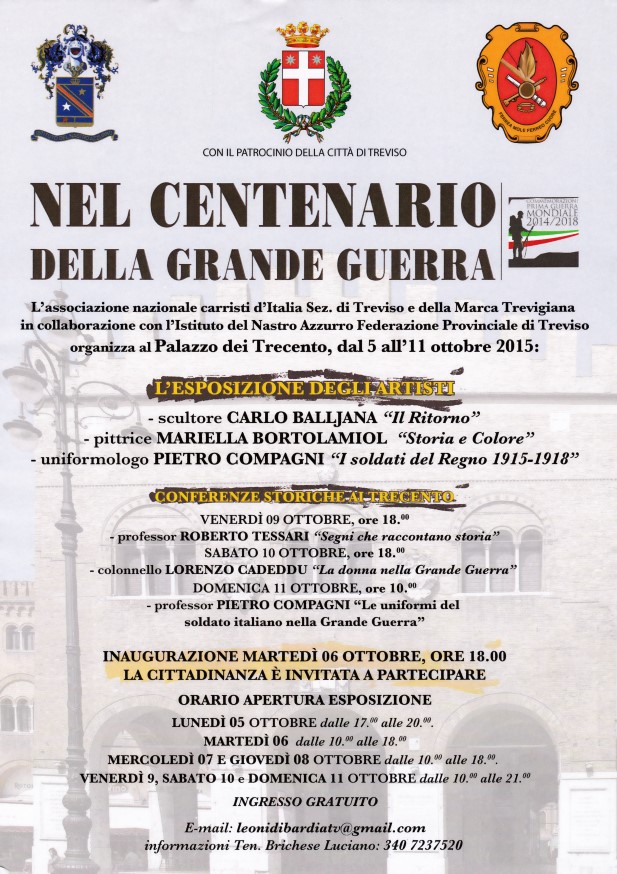 Nel contesto del XXIII° Raduno Nazionale dei Carristi d’Italia, dell’88° anniversario della Specialità ed in concomitanza con il Centenario dell’entrata in guerra dell’Italia nel primo conflitto mondiale si terrà presso il Palazzo dei Trecento di Treviso l’esposizione “Storia e Colore” unitamente all’esposizione di Opere dello Scultore Carlo Balliana e del Prof. Pietro Compagni.